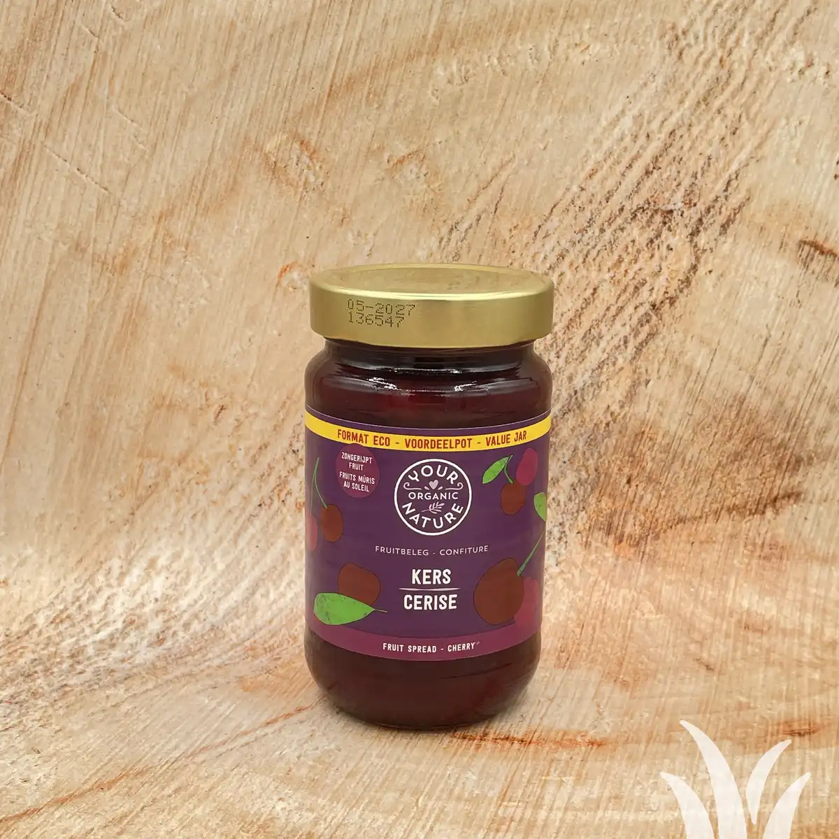 Puur Natuur produkt van Udea te Uden. 50% Kers*, geconcentreerd vruchtensap* (appel*, citroen*), water, geleermiddel: pectine, zuurteregelaar: calciumcitraat. Inhoud 375 gram
