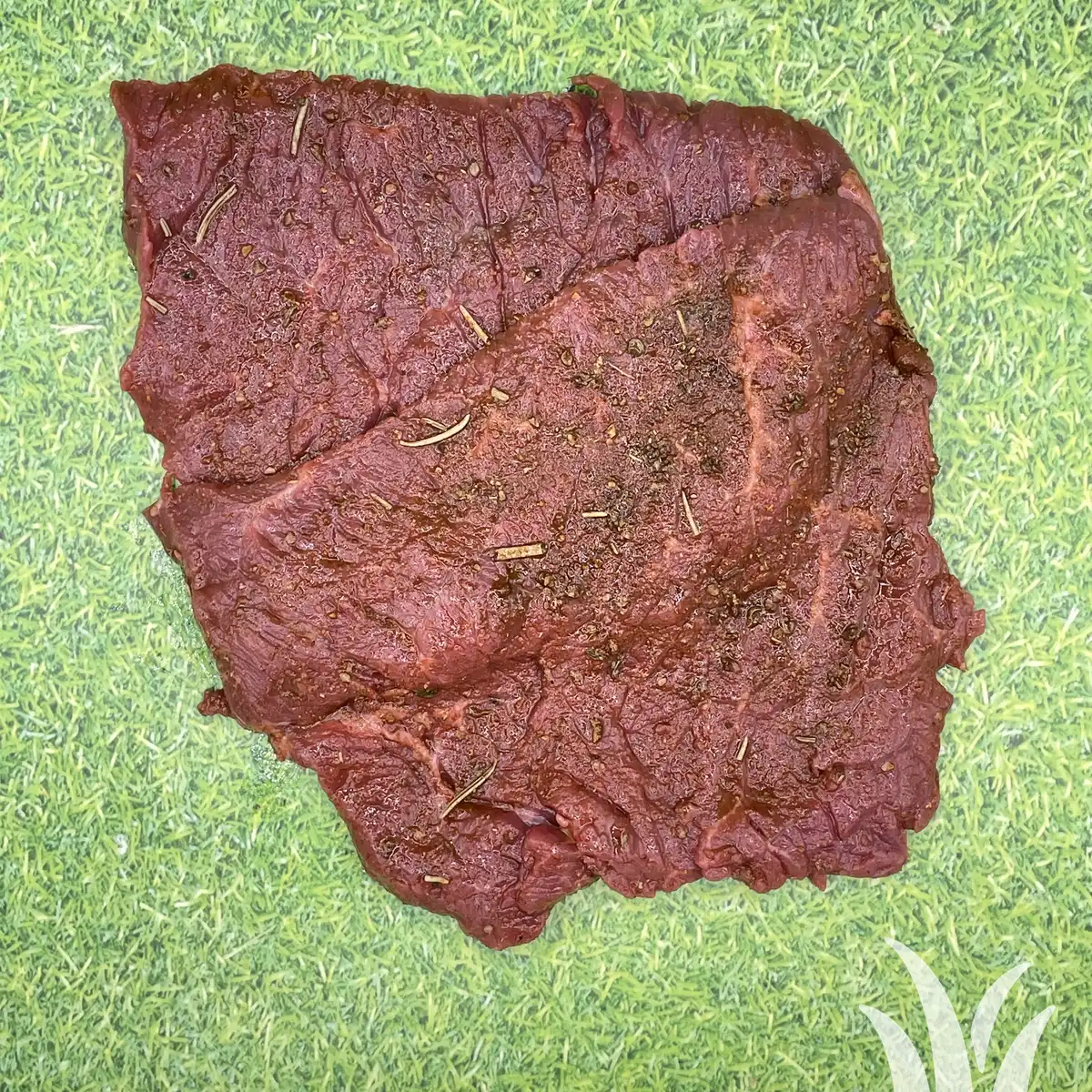 Herefords Graasrund. Mals plat runderbieflapje gemarineerd met zelfgemaakte marinade. Ca 2×1 min bakken in een hete pan zonder boter of olie. Weegt ca. 150 gram per stuk( worden gerekend naar gewicht)Kiloprijs;€ 32,00