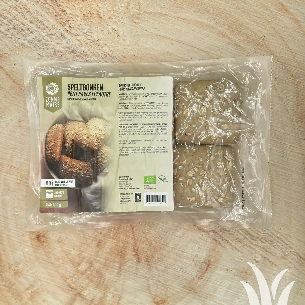 Inhoud 6 stuks= 300 gram Even afbakken in de oven; 20 min op 150 C hetelucht(niet voorverwarmen!)