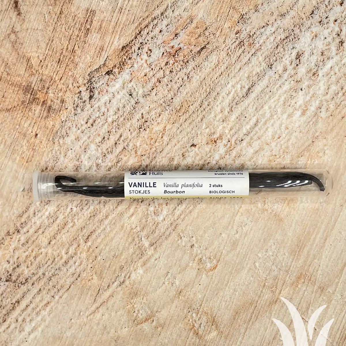Echte bourbon vanillepeul; extra geurig; verpakt in glazen buis Puur Natuur specerijen afkomstig van het Blauwe Huis.